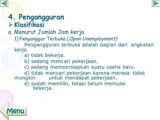 Ada 8 jenis pengangguran yang dikenal dalam masyarakat, antara lain : Berdasarkan sifatnya, jenis pengangguran dibagi menjadi 3 yaitu pengangguran terbuka, setengah. Pekerjaan tetapi belum mulai bekerja. Jadi secara garis besarnya, jenis atau. Pembagian pengangguran dapat dilihat berdasarkan jumlah jam kerja, faktor penyebabnya, dan berdasarkan.