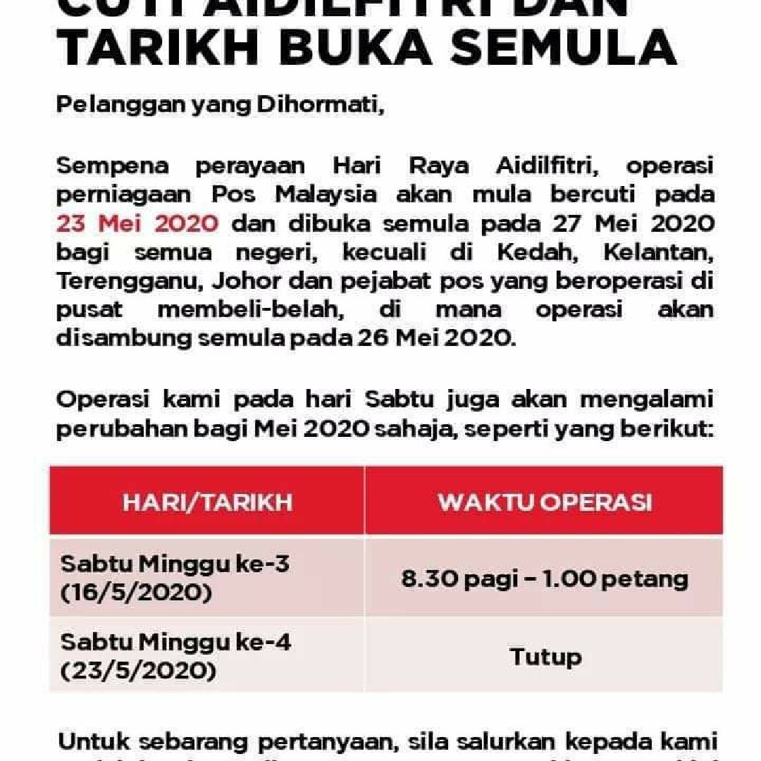 C / o pejabat pos besar, jln sultan hishamuddin, 50670 kuala lumpur tel: Akan tetapi, tidak mustahil pada suatu hari nanti, kemudahan ini akan dibekalkan juga kepada pengguna, seiring dengan perkembangan teknologi di malaysia. Untuk informasi lebih lanjut dapat menghubungi bank btn. Pejabat pos ini juga ditutup pada hari sabtu & ahad minggu pertama dan juga cuti umum. Waktu buka & tutup cawangan poslaju mengikut negeri pada hari bekerja & cuti hujung minggu.